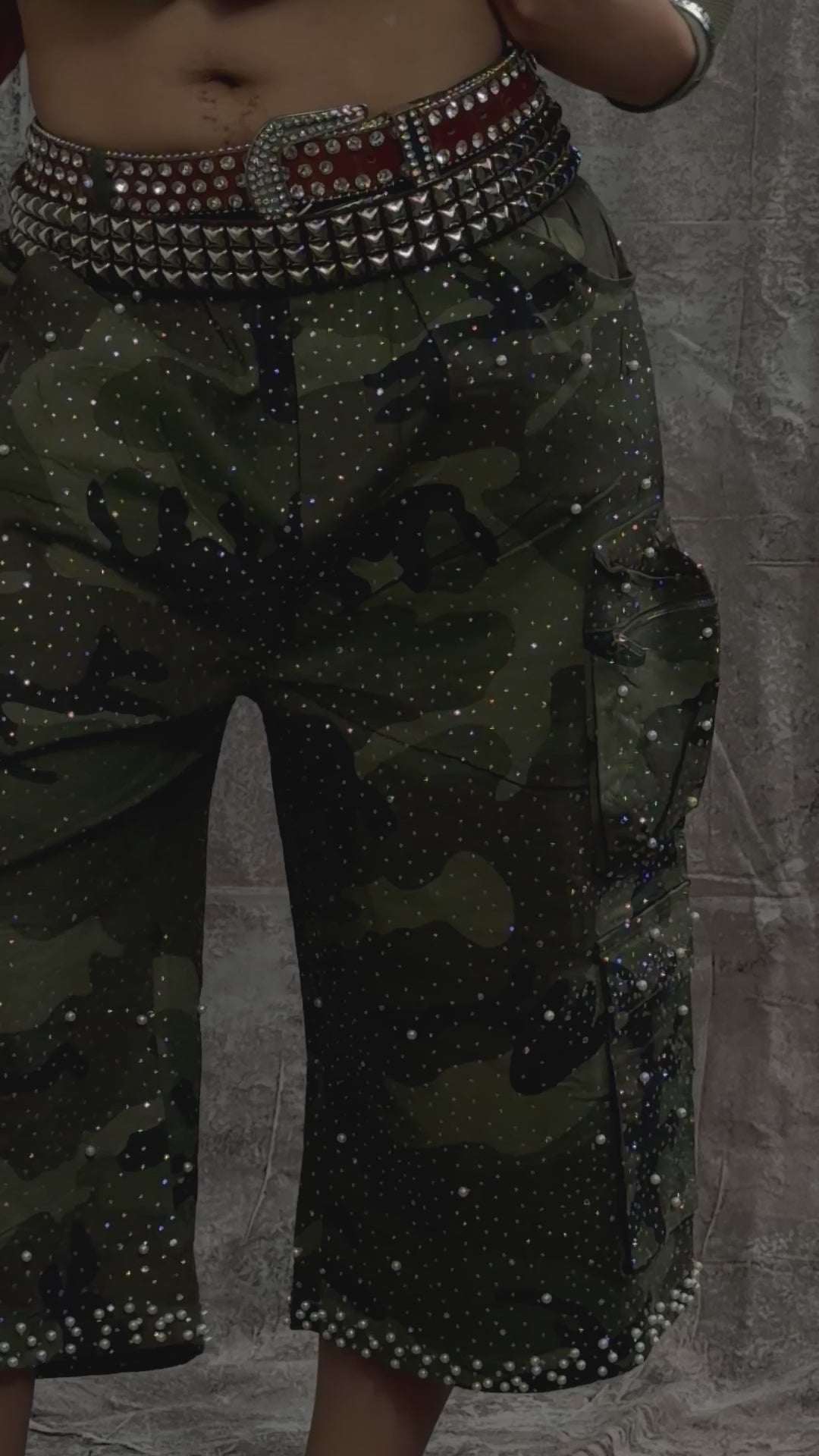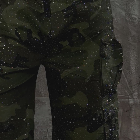 These camo cargo jorts feature a relaxed wide-leg cut, multi-pocket utility design, and a full rhinestone dust finish for a standout shine. Crafted from durable cotton with metal hardware details and reinforced stitching. Designed to be functional, bold, and easy to style.