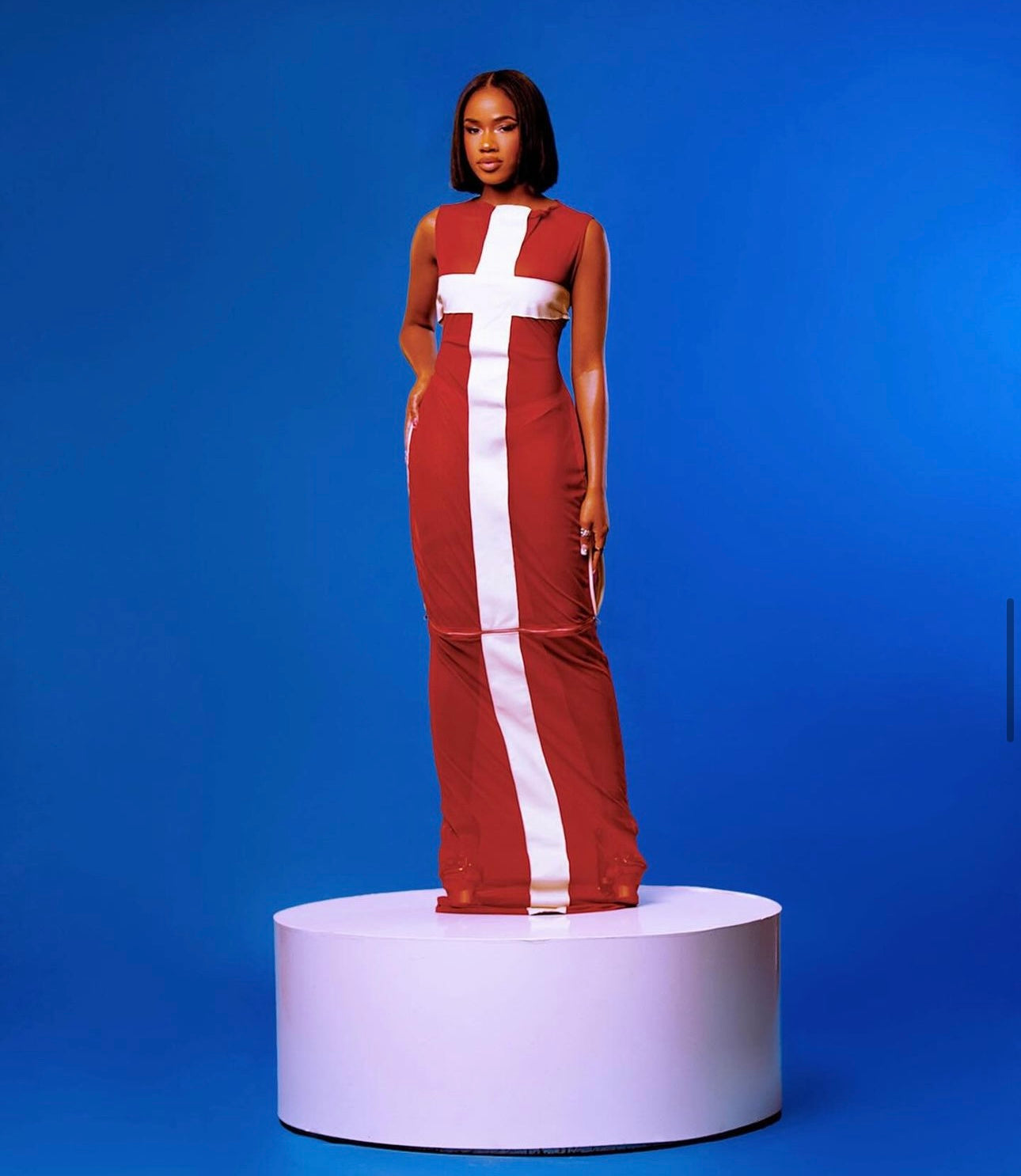 This sleek, form-fitting dress transforms into a striking two-piece set with a detachable lower half, offering both elegance and versatility. The bold contrast paneling enhances its structured silhouette, making it a piece that merges sophistication with adaptability.