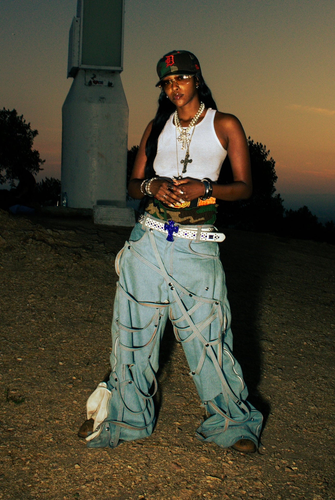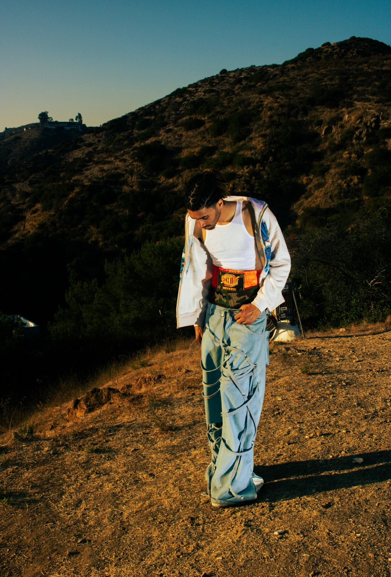Cut from deep light Japanese denim, these engineered pants blur the line between function and abstraction, with side panels that peel open like shifting tectonic plates. A detachable map of Detroit drapes like a relic of the past and future—an urban artifact in constant flux.