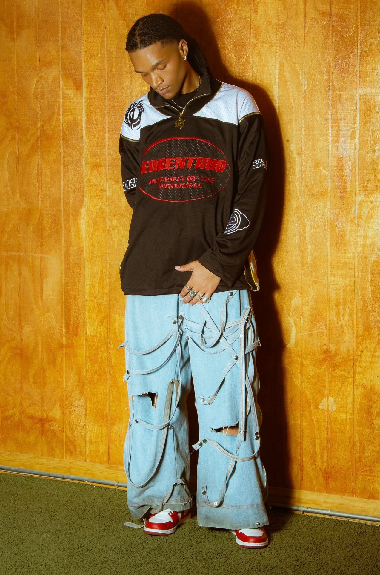 A kinetic manifesto of radical individuality, this deconstructed moto jersey shifts form with detachable sleeves and bold embroidered sigils. Engineered in perforated mesh with asymmetric detailing.
